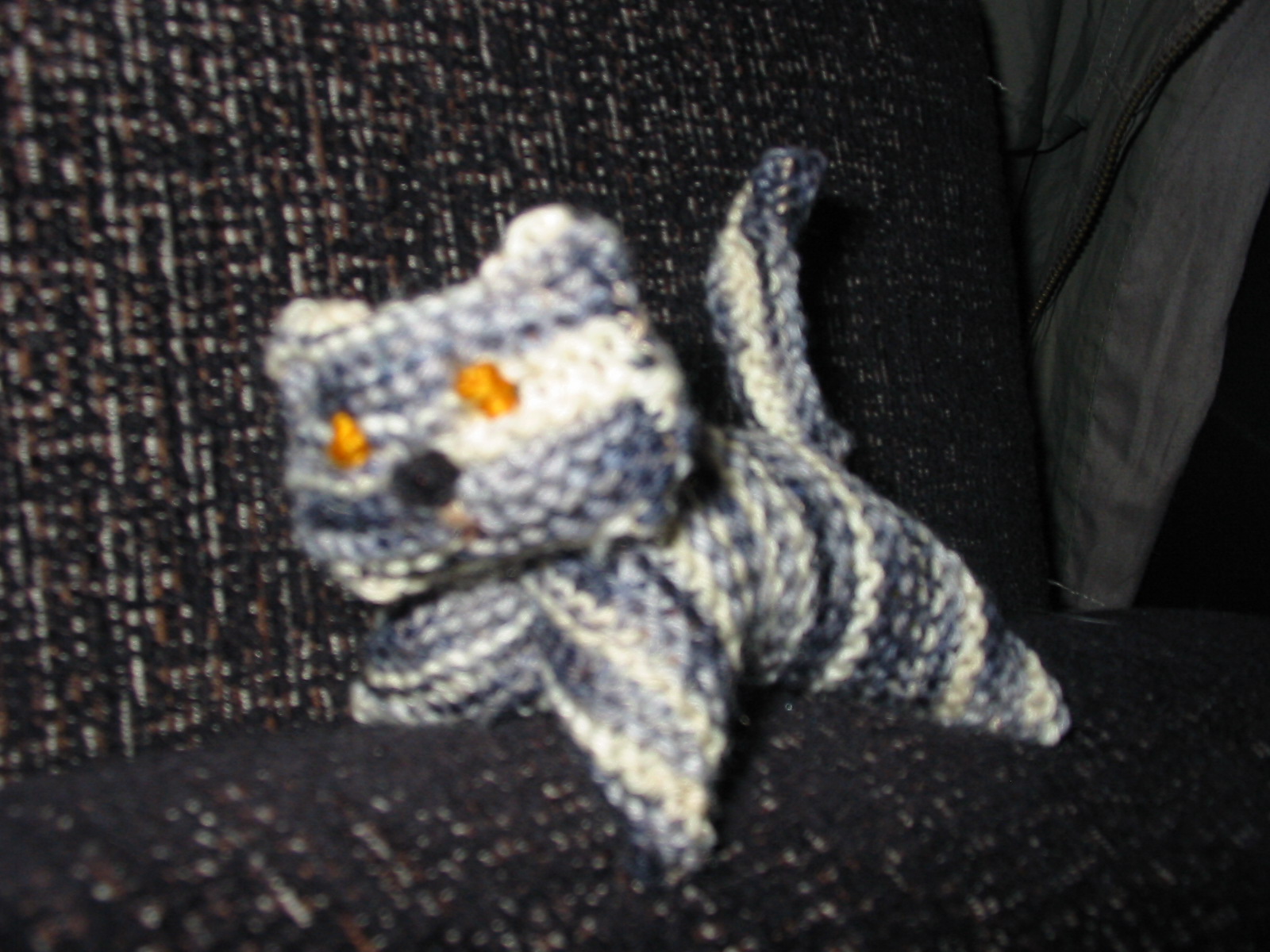 It's got the same pink kitten buttons I used on my boobholder. It's (obviously) not very me, but I think she'll really dig it. I adore the finished product even if I did get SICK of the pattern repeat & the yarn. Today I started a hat for my BIL. It's gonna be a basic stripey earflap stocking cap with a puffball on top, but it's gonna have a detachable beard & mustache. It's some fluffy mystery acrylic.